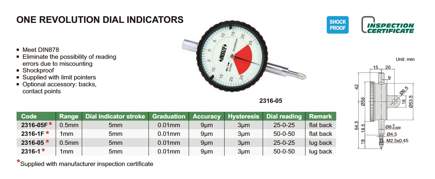 One Revolution Dial Indicators | Insize 2316 Series | Range 0.5mm / 1.0mm | Flat Back / Lug Back | Shockproof