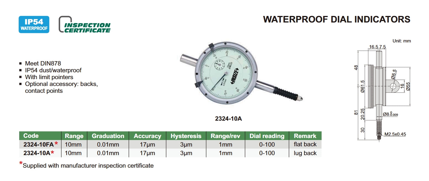 IP54 Dust/Waterproof Dial Indicators | Insize 2324 Series | Range 10mm | Resolution 0.01mm | Dial Reading 0-100 | Bezel diameter 61.5mm | Flat Back/Lug Back