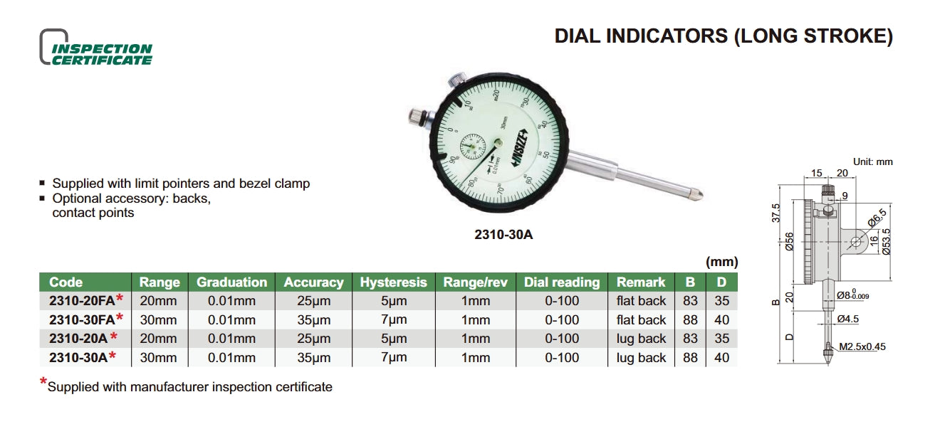 Long Stroke Dial Indicators | Insize 2310 Series | Range 20mm / 30mm | Resolution 0.01mm | Dial reading 0-100 | Bezel diameter 56mm | Flat Back / Lug Back