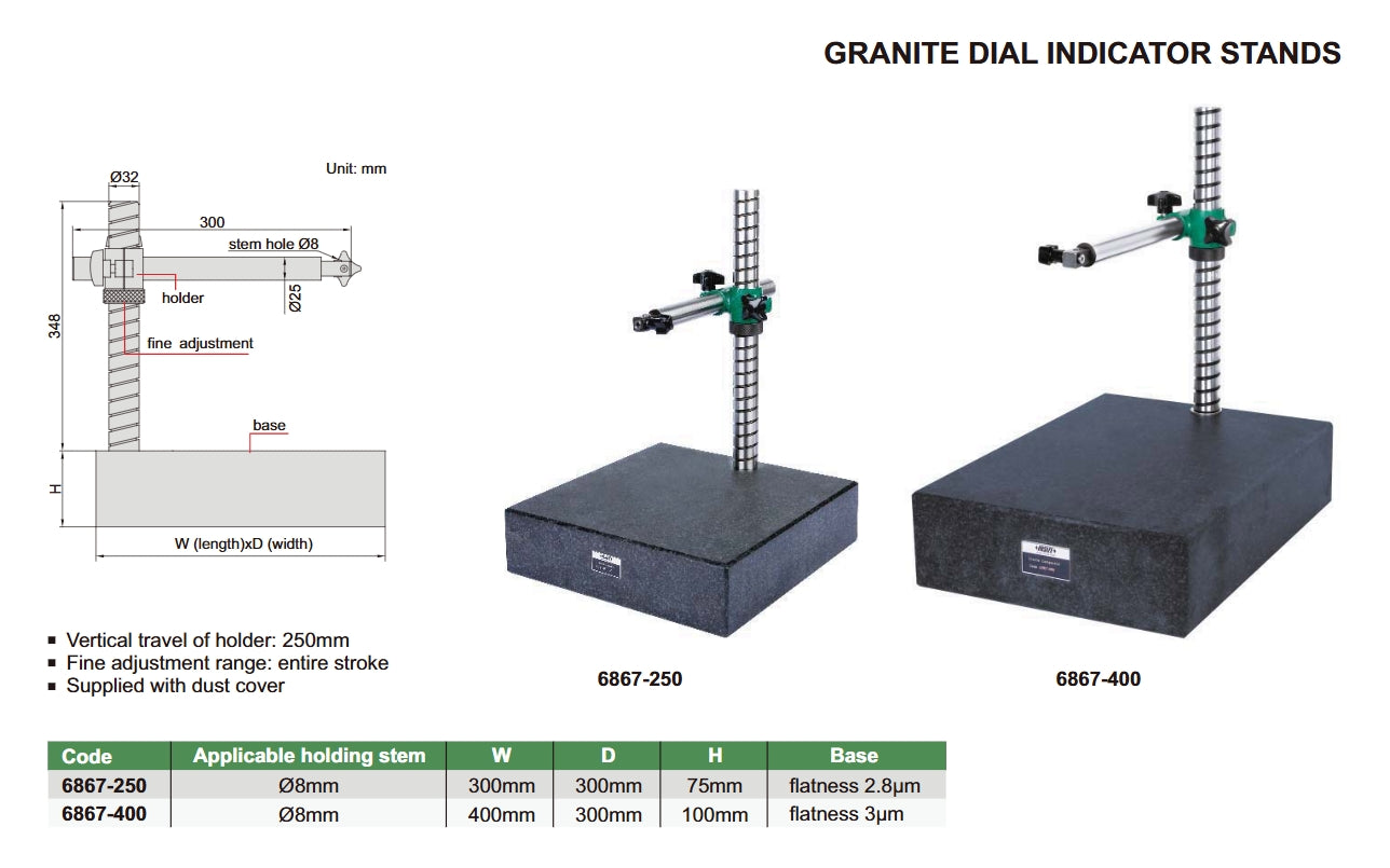 Granite Dial Indicator Stand | Insize 6867-250 | 300x300x75mm granite base | Vertical travel of holder 250mm | Fine adjustment range: entire stroke | Holding stem diameter 8mm