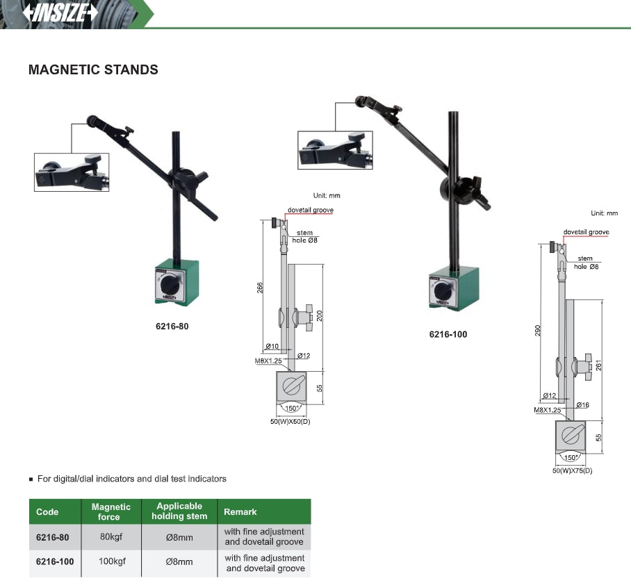 Magnetic Dial Indicator Stand | Insize 6216-80 | 80kgf force | Fine adjustment and dovetail groove | Holding stem diameter 8mm